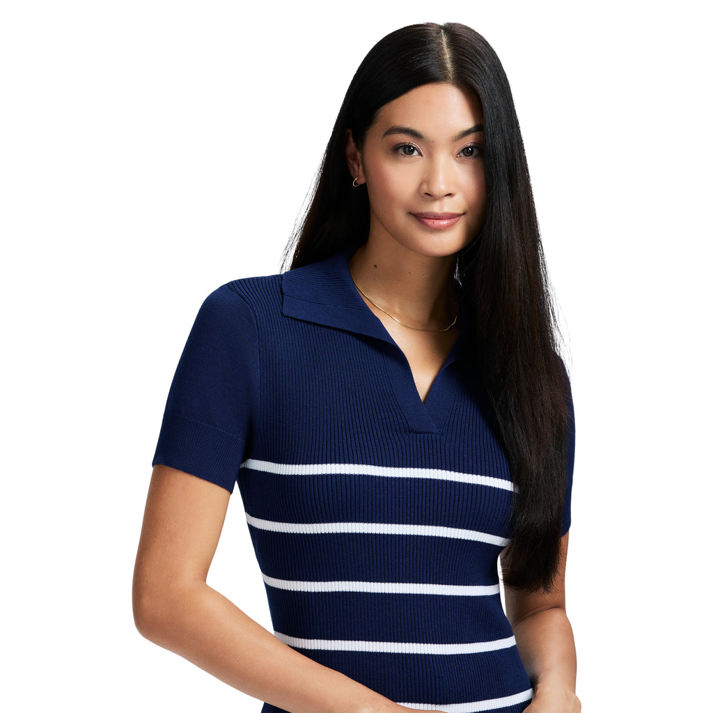 Where effortless style meets cozy comfort. Our short-sleeve sweater features a striped rib-knit that not only elevates your look but also flatters your figure with its slightly contoured waist. Designed with jersey sleeves and an open ribbed collar, it’s crafted with just the right amount of stretch for a comfortable fit that moves with you all day long.