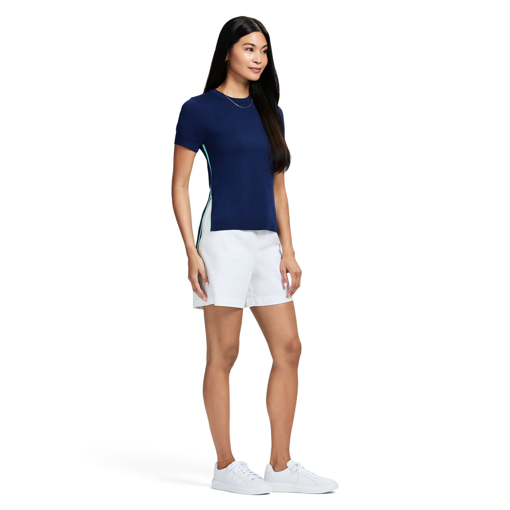 Made from soft yarn in a jersey stitch, our short-sleeve crewneck has a fun, sporty vibe featuring stylish details. A fun pop of color along the side seam highlights the rib hem and side slits, providing easy access to pockets. With a longer back hem for added coverage. Plus, it’s machine washable for easy care. Elevate your look with a perfect blend of style and comfort.