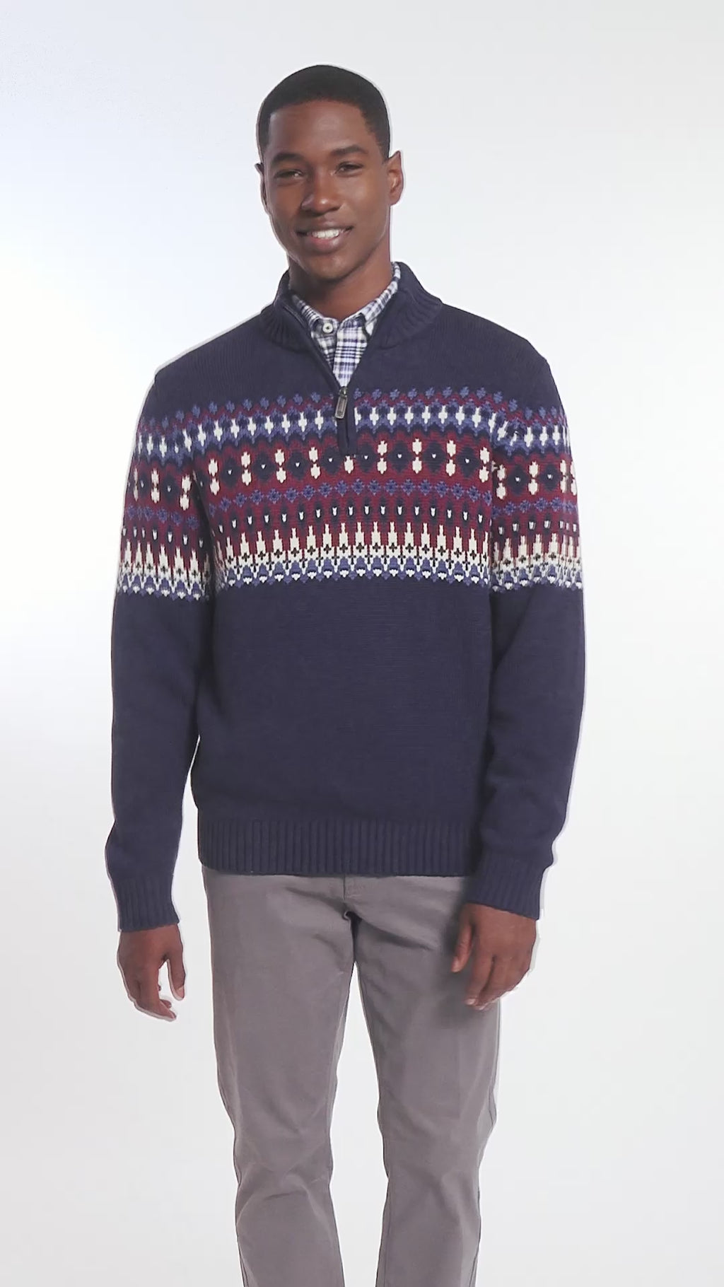 Fair Isle--at the first sign of frost. This super soft, 1/4-zip pullover plays the part when there's a chill in the air. Classic fit with a classic pattern for chestnuts roasting by an open fire.