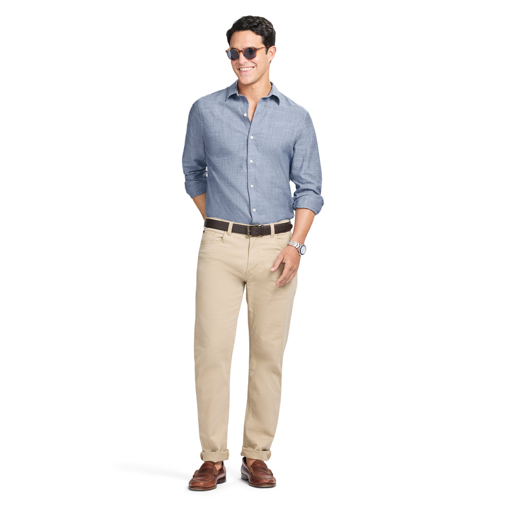 With a soft feel and a smooth finish, this long sleeve button-up shirt is cut in a classic fit. Finished with hidden collar buttons and spade pocket details.