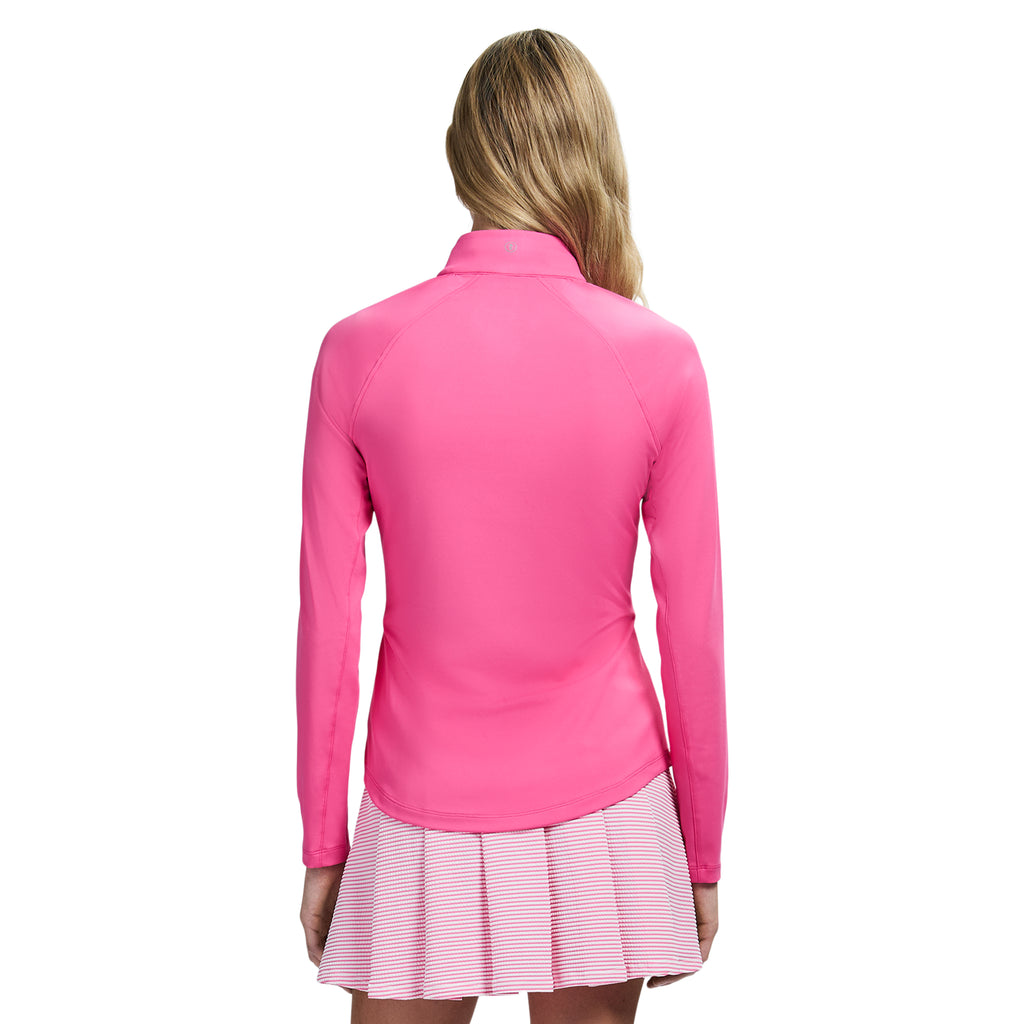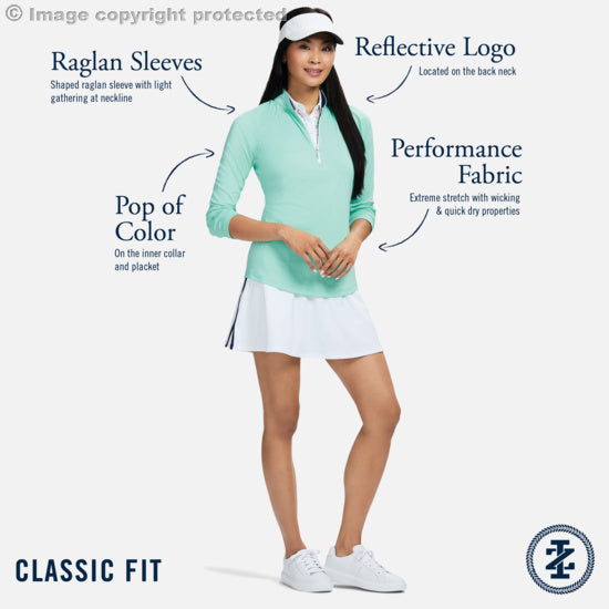 Stay active in this stylish quarter-zip pullover, making it perfect for layering in cooler weather while maintaining a trendy look. With a solid body and contrast details in the inner collar and placket, it features a modern logo zip puller. The raglan sleeves and light gathering at the neckline add shape, while moisture-wicking fabric and stretch keep you comfortable. The curved side seams and hem create a flattering silhouette, plus it’s machine washable for easy care—perfect for on-the-go wear.