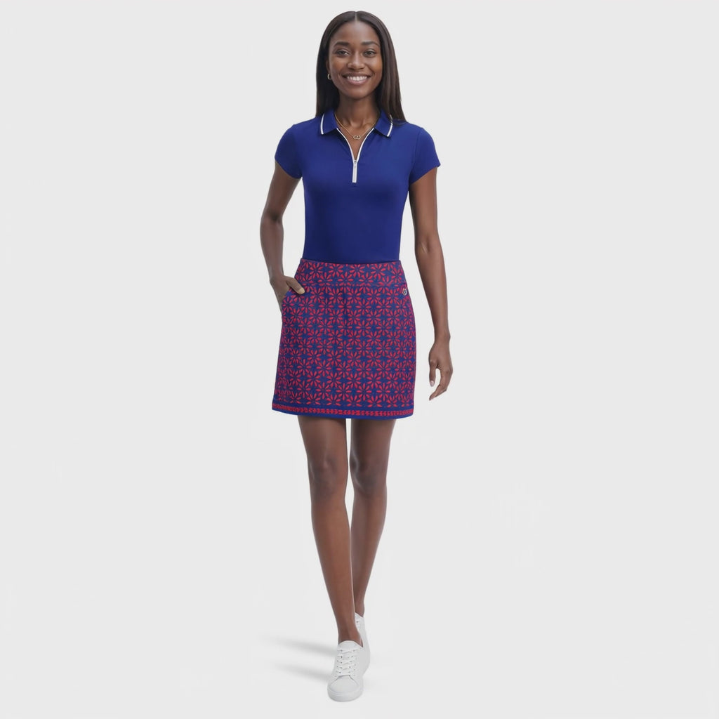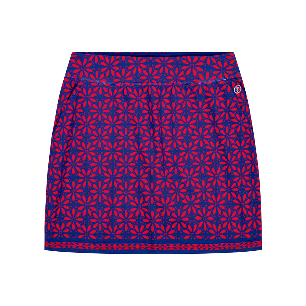 The Bree Printed Skort features a printed woven shell, performance stretch, and A-line styling. Finished with built-in knit shorts, side pockets, and a 17" length. Machine washable for easy care.
