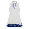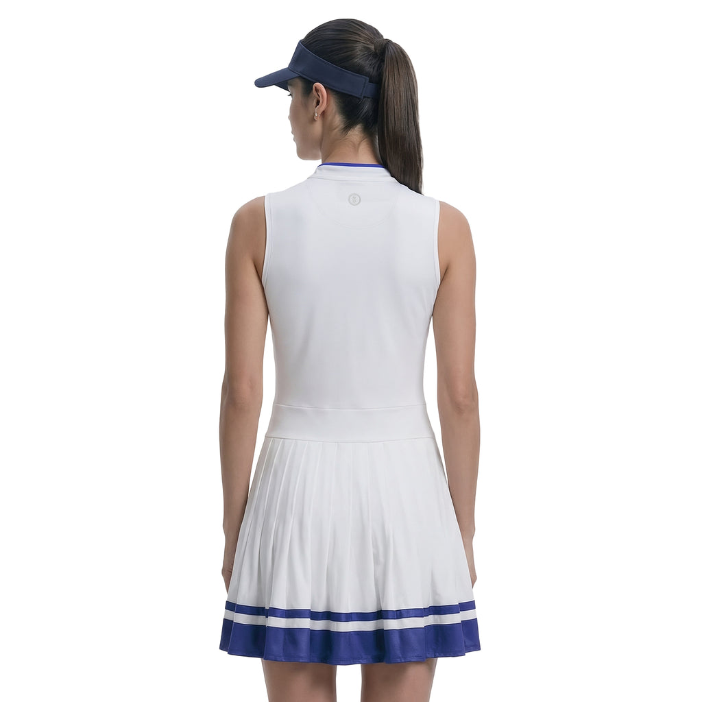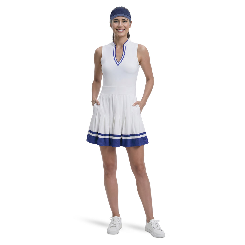 A pleated dress with a V-neckline and contrast stripe details. Moisture-wicking, quick-drying fabric with performance stretch helps keep you comfortable. Finished with a tummy-shaping waistband, side seam pockets, and an invisible zipper. Machine washable for easy care.