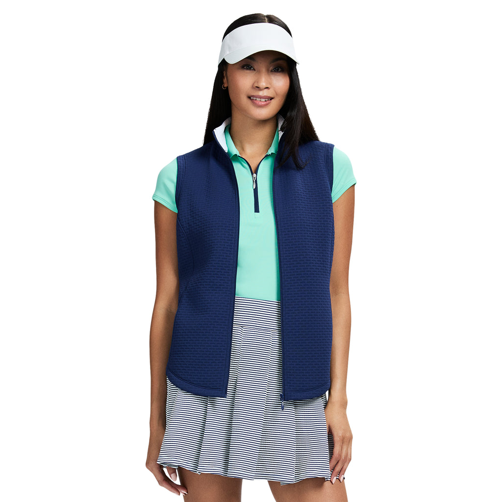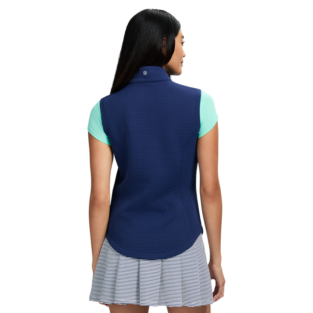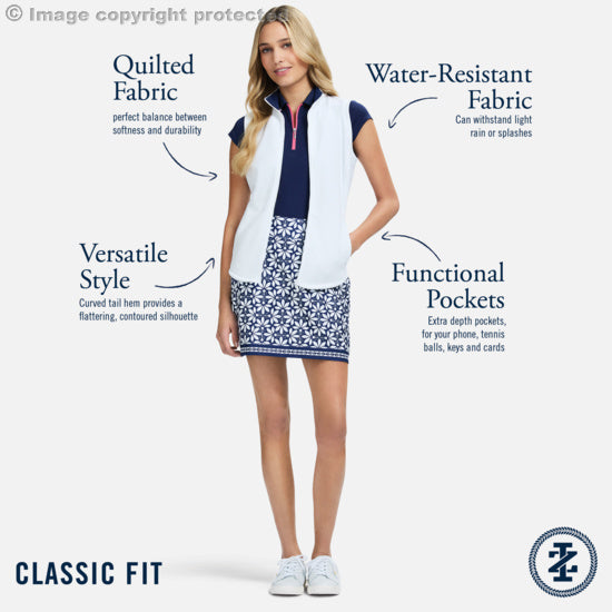 Stay dry and stylish in our quilted jacquard knit vest, this outerwear layering piece is designed to keep you warm while enhancing your outfit. With a full zip front and logo puller, it's easy to throw on and go. The contrast inner collar adds detail, while shaped side seams and a curved tail hem provide a flattering fit. Functional side pockets complete the look, combining performance and practicality. Perfect for both casual outings and outdoor adventures.