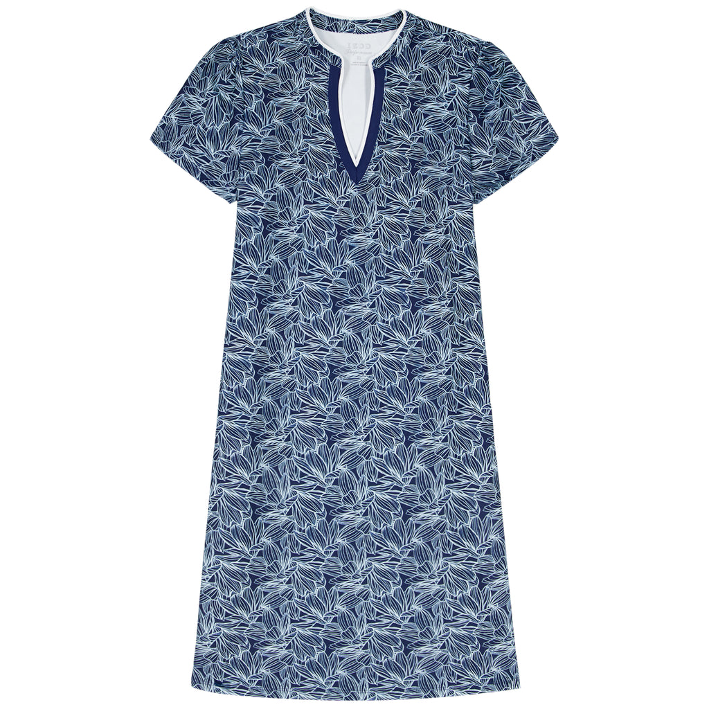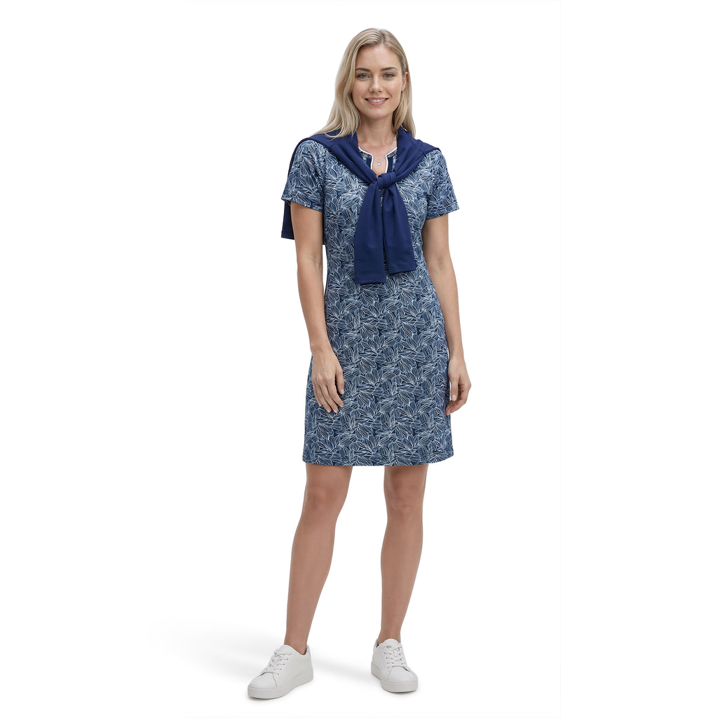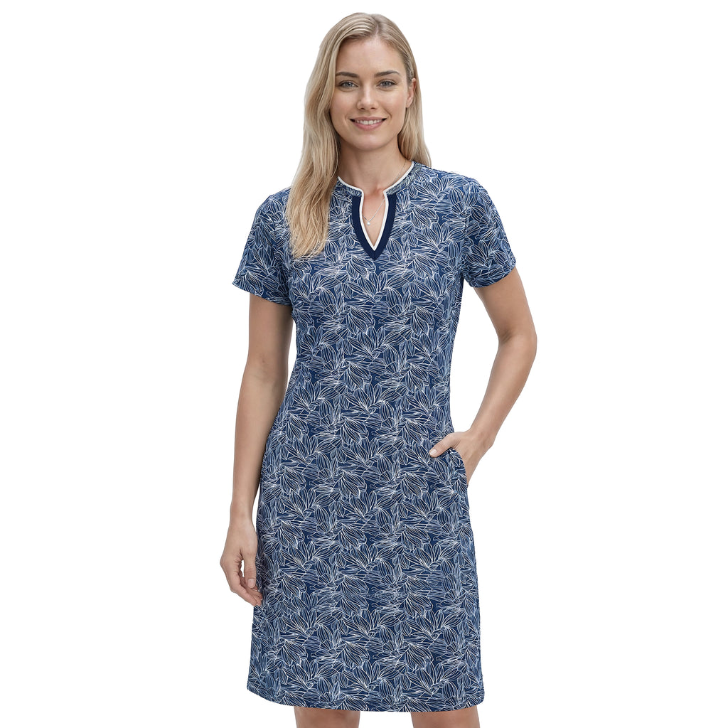 The Sara Short Sleeve Dress has an A-line cut, short sleeves, and pockets with contrast trim. Made with performance stretch fabric that wicks moisture and is machine washable.