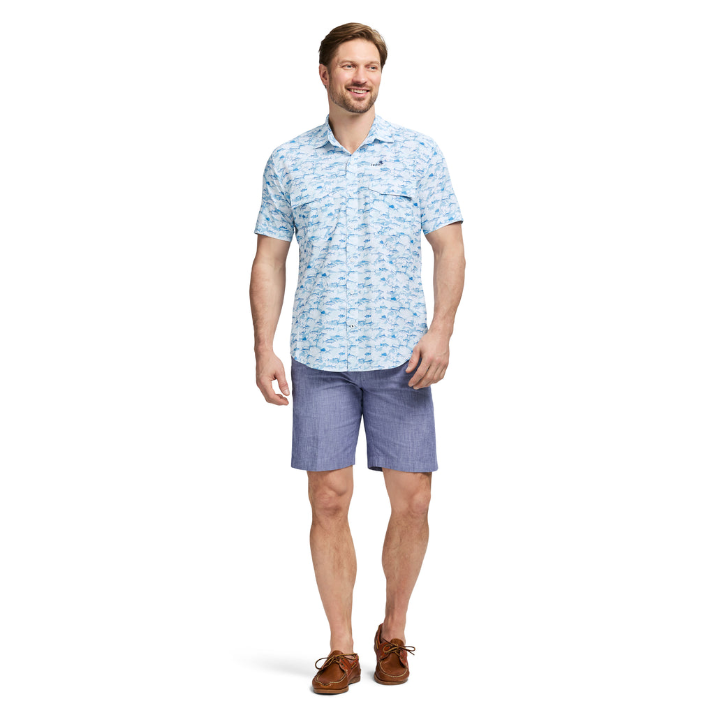 Engineered for everything under the sun. This lightweight, breathable button down has all the performance comfort of quick-drying fabric with UV-45 sun protection along with refined styling. The athletic fit looks great untucked, and the short sleeve shirt is finished with a point collar, front flap and patch pockets along with a mesh-lined cape back for ventilation and a cool bungee cord loop.